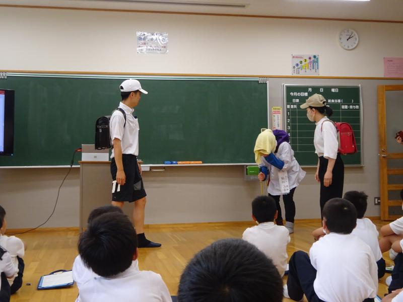 七尾警察署の方と一緒に,合言葉である「いかのおすし」の確認をしました。また,児童参加によるデモンストレーションも行いました。自分事として捉え,考えることができました。