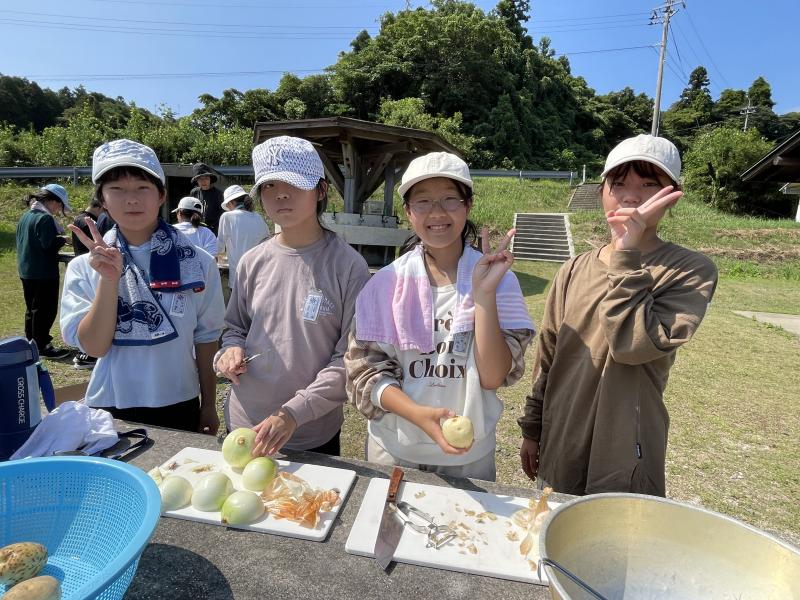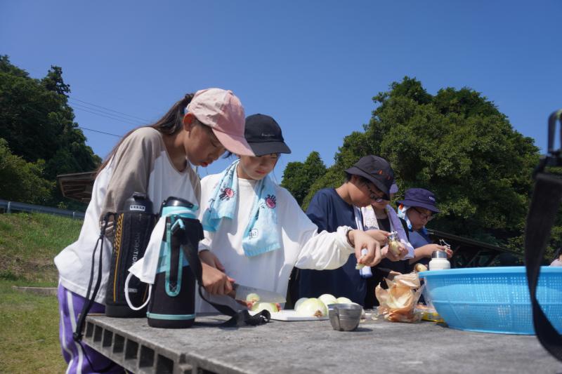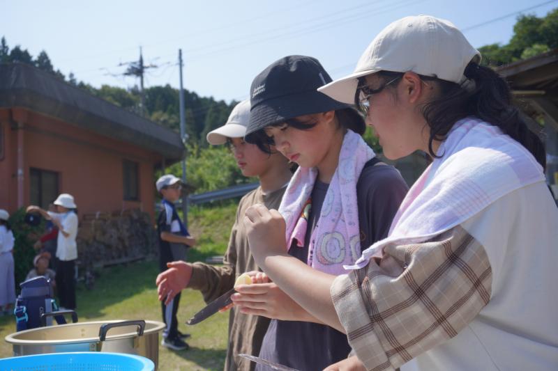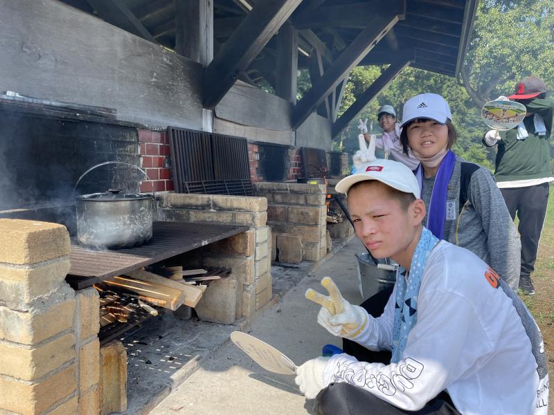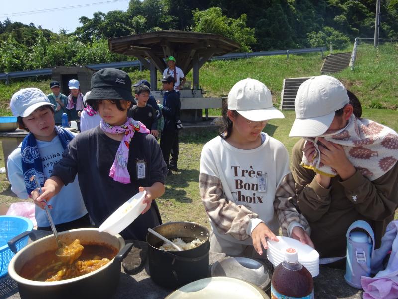 米とぎ,野菜切り,火起こし,かまどで炊飯・カレー煮込みを班のみんなで協力して行い,カレーを完成させました。どのグループもおいしくできました。