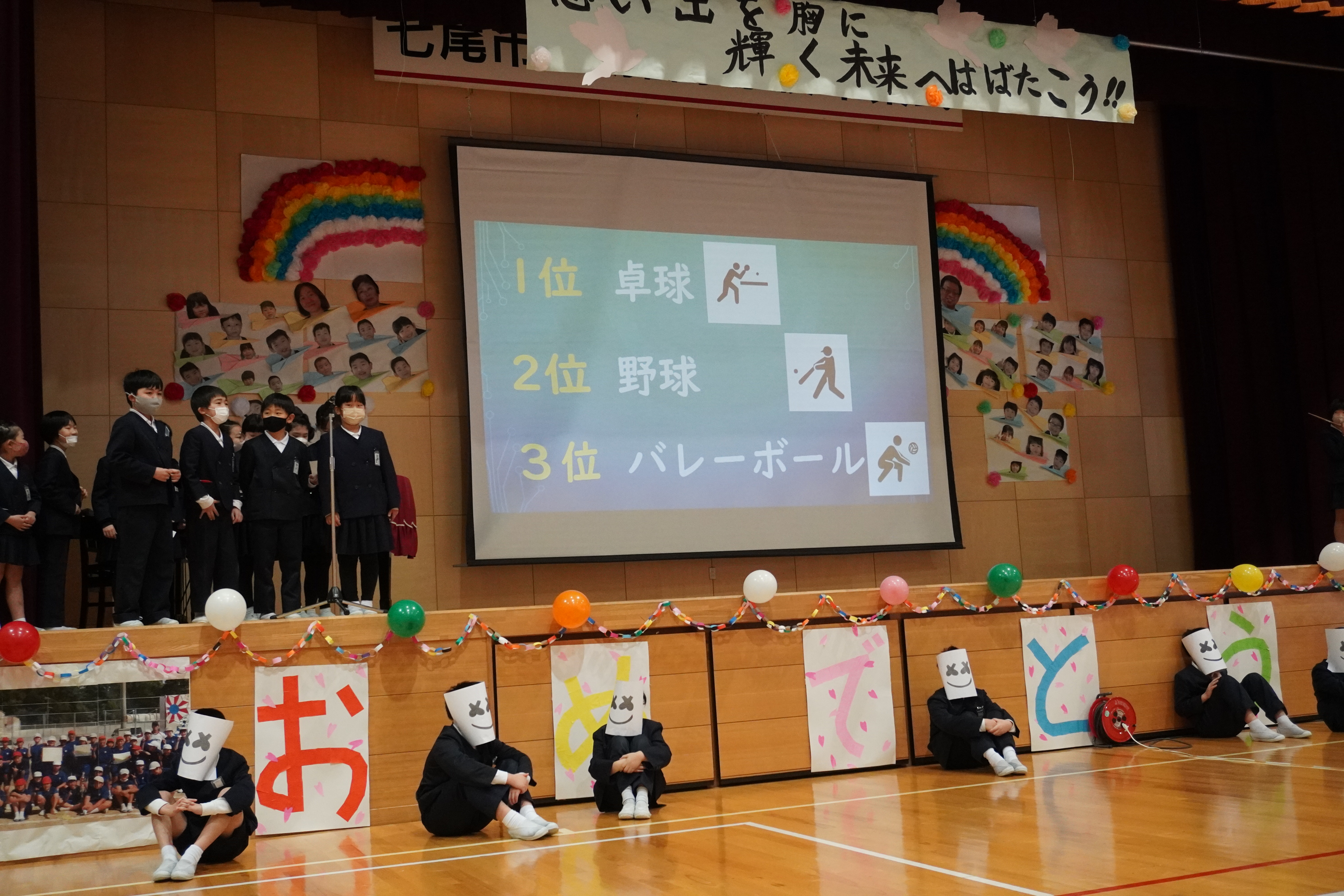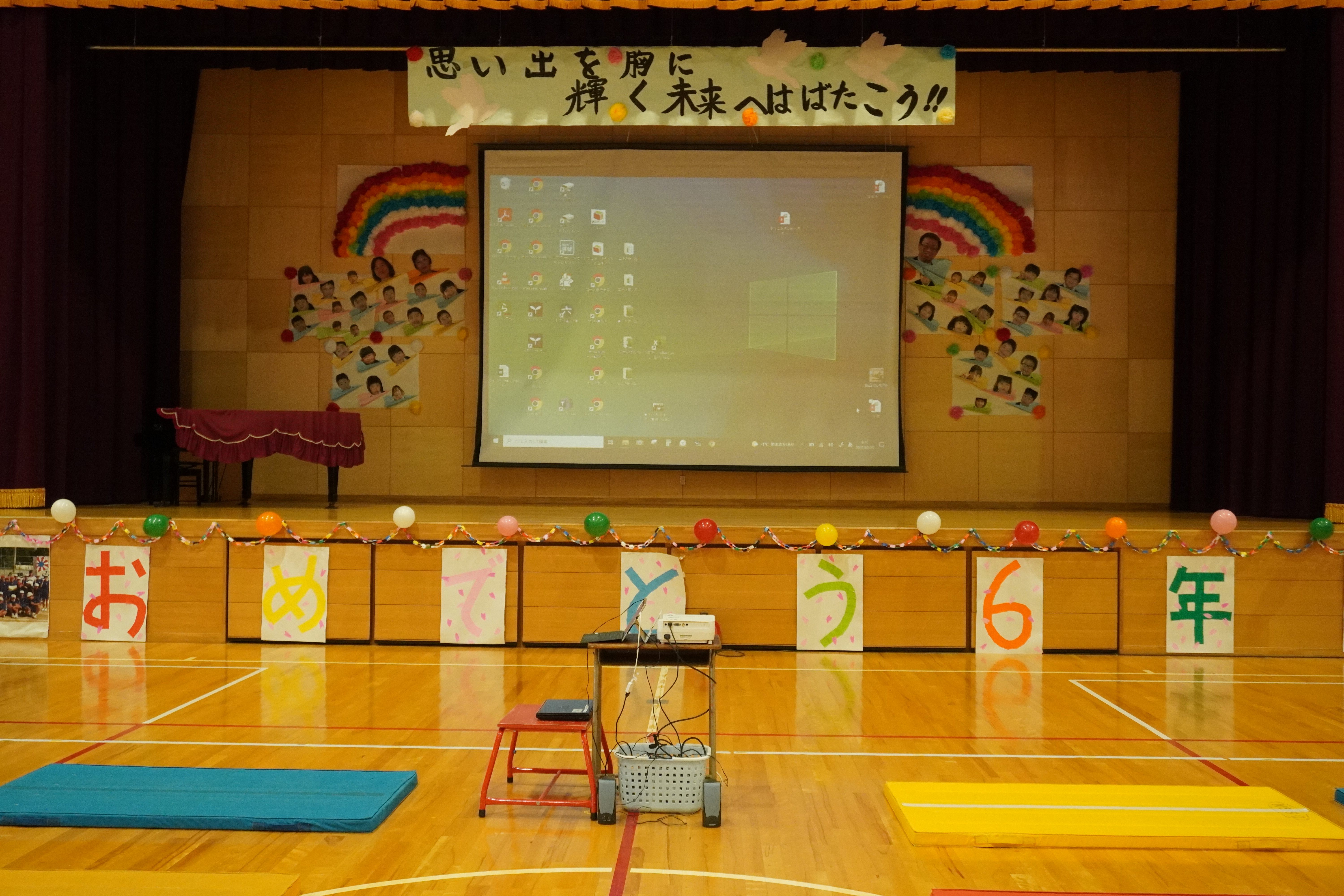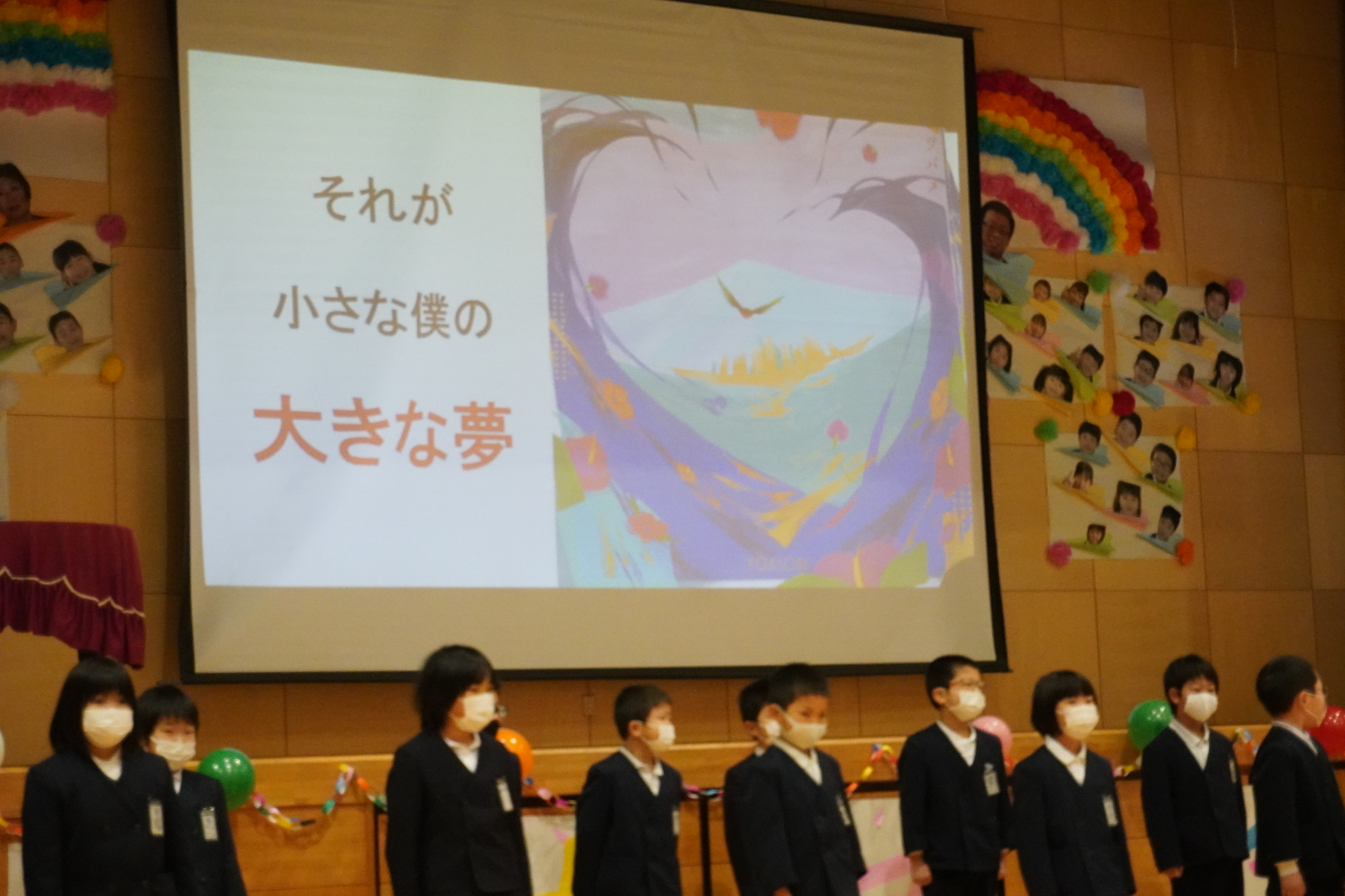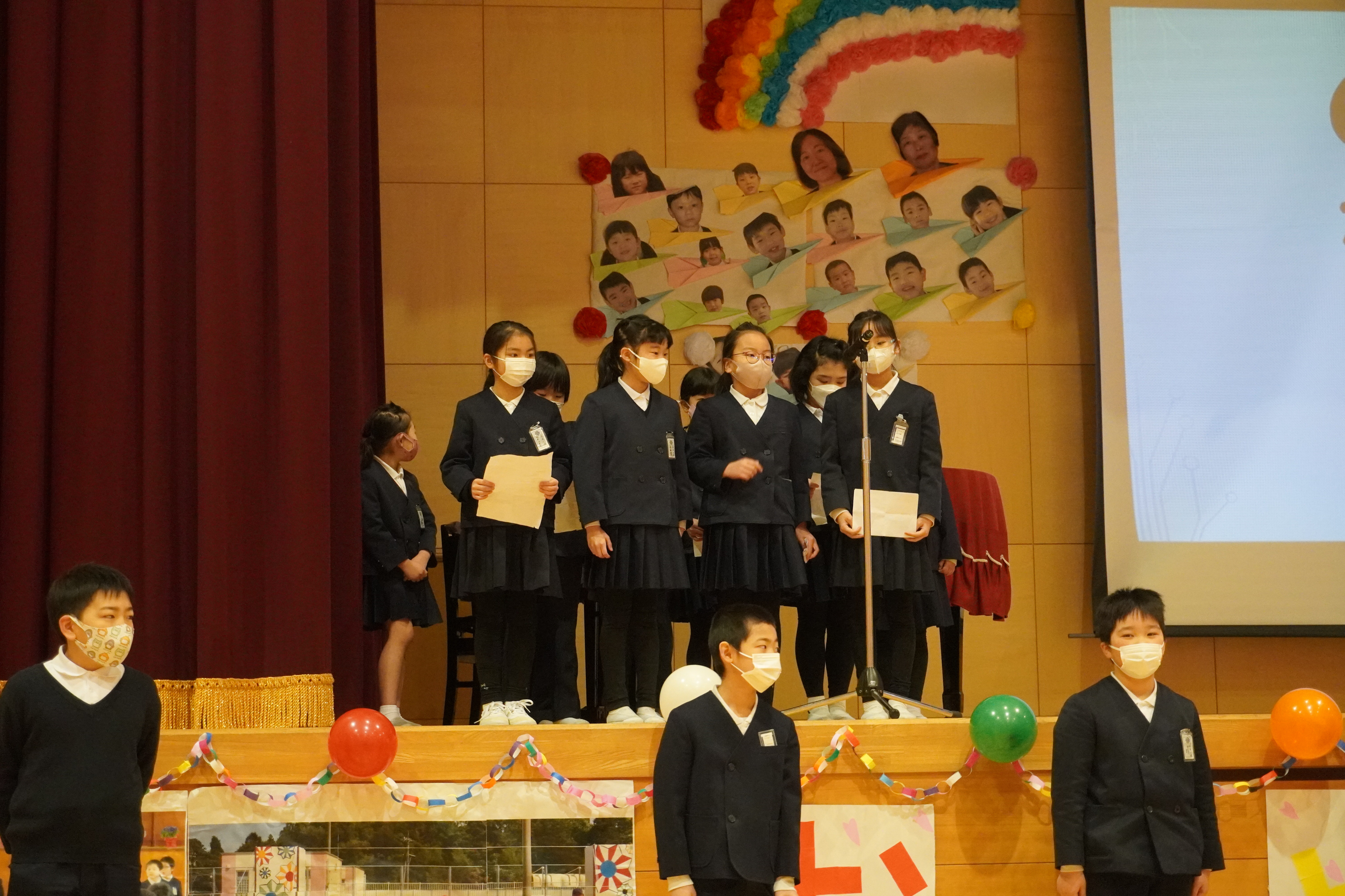 2022年3月1日 11時44分2月25日(金)6年生送る会を行いました。ステージには「思い出を胸に輝く未来にはばたこう!!」と書かれてあり、1年生から5年生の心のこもったあたたかい雰囲気の会場での素敵な会となりました。今年はコロナ対策のため全校児童が集まることはせず、自分の学年の出し物以外は教室でのオンラインの参加となりました。しかし、各学年の出し物には6年生への感謝の気持ちが込められており、それを受け取る6年生のまっすぐな瞳に心打たれました。そして、昨日、6年生が感謝のメッセージを各教室へ届けていました。