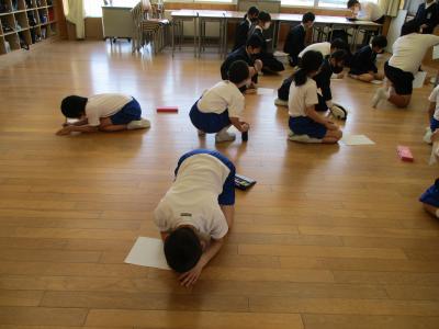 体育館は今も立ち入り禁止のため,できていなかった体育ですが,玄関スペースを広くしたり,会議室の物を動かしたりして少し広い場所を確保し,再開しました体育館用具庫から,玄関スペースでも使えそうな用具を先生達で相談して出してきました。マット,ラダー,なわとびなど,いつもの体育よりも大きな動きはできませんが,体を動かすことができると気持ちも晴れやかになりますね体育の最初にしている体つくり運動も,久々でしたが,3年生とても上手でした友達と一緒にタイミングを合わせてなわとびを跳ぶのもバッチリおみごとです