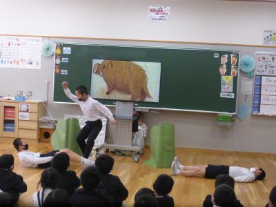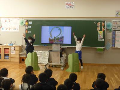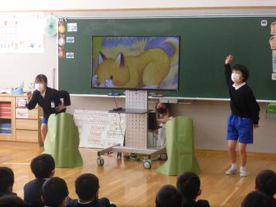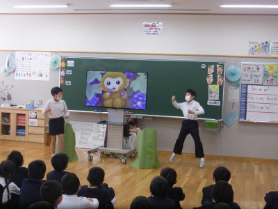 2021年3月25日 08時34分 3月23日(火)、3年生が「Who are you?」の学習の劇を1・2年生に披露しました。身振り手振りを交えての熱演でした。1・2年も3年生の発表を見た感想をしっかり発表したいました。そして、この日がジェシカ先生の本校での最後の授業日となりました。3年生、ジェシカ先生ありがとう!