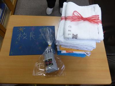 2021年3月8日 14時46分3月5日(金)6年生から感謝の手紙と自分たちで作ったハンカチのプレゼントが各先生方にありました。また、雑巾もプレゼントしてくれました。6年生、ありがとう!!