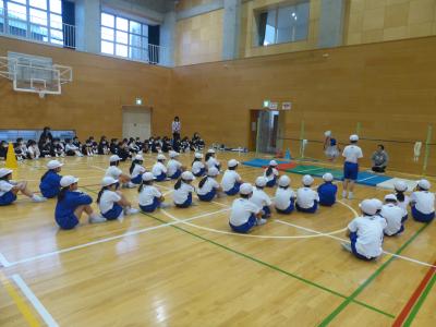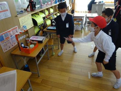 体育館は今も立ち入り禁止のため,できていなかった体育ですが,玄関スペースを広くしたり,会議室の物を動かしたりして少し広い場所を確保し,再開しました体育館用具庫から,玄関スペースでも使えそうな用具を先生達で相談して出してきました。マット,ラダー,なわとびなど,いつもの体育よりも大きな動きはできませんが,体を動かすことができると気持ちも晴れやかになりますね体育の最初にしている体つくり運動も,久々でしたが,3年生とても上手でした友達と一緒にタイミングを合わせてなわとびを跳ぶのもバッチリおみごとです