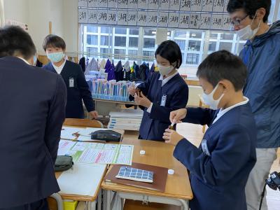 2020年12月1日 10時21分11月26日(木)6年生は能登里海教育研究所の谷内口孝治事務局長と浦田慎主幹研究員のご協力を得て、地域の川の水と朝日小ビオトープの水の水質検査を行いました。谷内口先生からは水のきれいさは水質検査の結果だけでなく水生生物の種類も併せて考えることを教えていただきました。