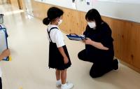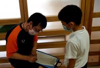 2020年7月13日 10時59分1年生が「先生となかよし大作戦」を行っています。まず、自分の名前を言い、「サインをお願いします。」と伝えます。サインしてもらった後は、「〇〇先生、ありがとうございます」「〇〇先生、よろしくお願いします」と上手に返していました。