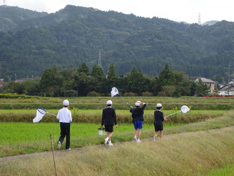 虫取り網を構えながら田んぼ道を歩く子供達の姿。その姿を見て「自然いっぱいの朝日地区,素敵ですね。」と講師の方々がおっしゃっていました。豊かな自然に囲まれていることは当たり前でないことに気付いた日でした