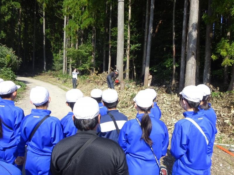 まずチェーンソーで約25mの杉の木を伐採するところを実際に見せていただきました。多い時で一日に50本伐採するそうです。なぜ間伐をするのか等,健康な森・元気な森にするための活動について教えてもらいました。
