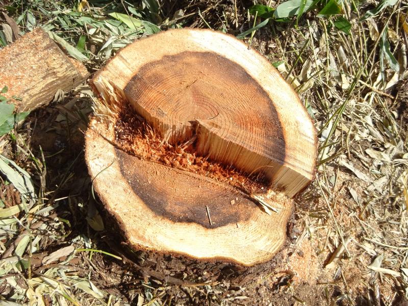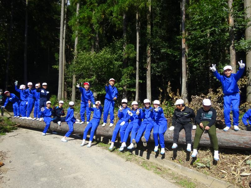 今回伐採した杉の木の年輪を数えてみると…約60歳。自分たちの5倍も生きてきた木ということがわかった後,自然と木に触れる姿が。そのうち木の力強さを感じ,乗ってみる子供達。6年生34人が乗っても大丈夫でした