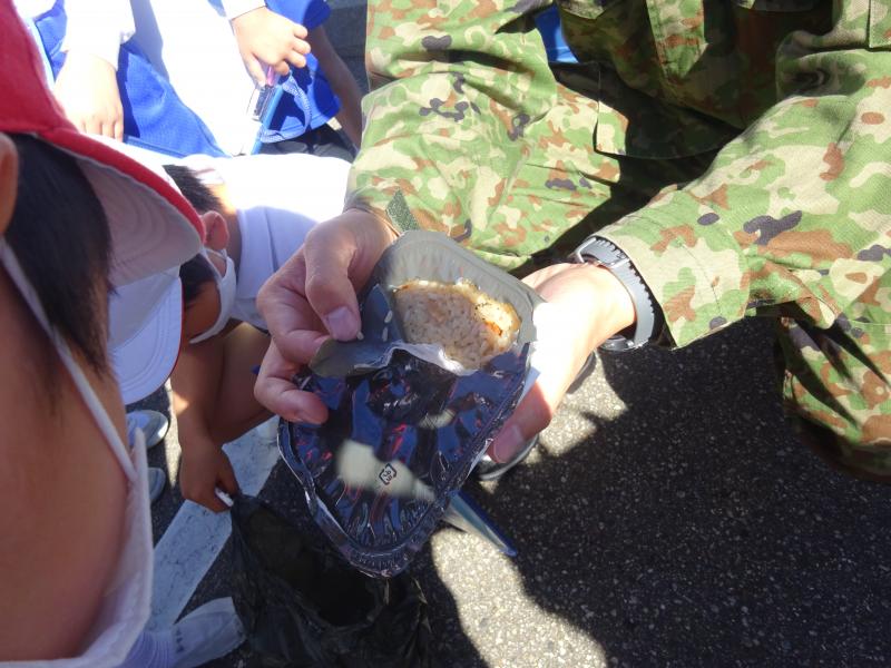 屋外の活動では,自衛隊が活動時に乗っている1/2トントラック(パジェロ)に実際に乗せてもらい,普通の車と違う所を見て,触って,確認することができました。また,災害時の非常食も見せてもらうことができました。水で非常食を加熱している時には,袋から湯気が上がった瞬間に子ども達から歓声が聞こえてきました。加熱した後のものを実際に見たり,触ったりしながら比べていました。