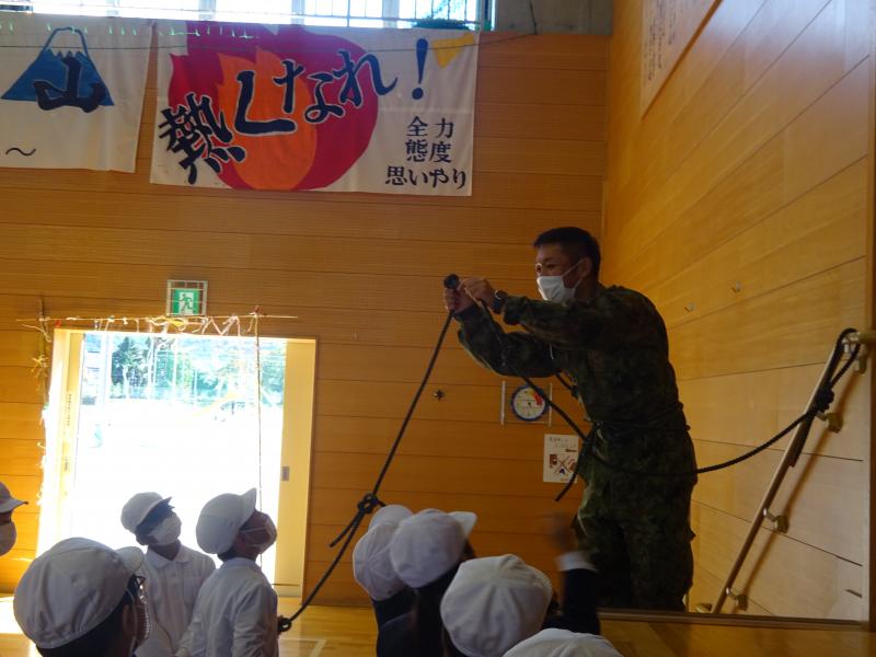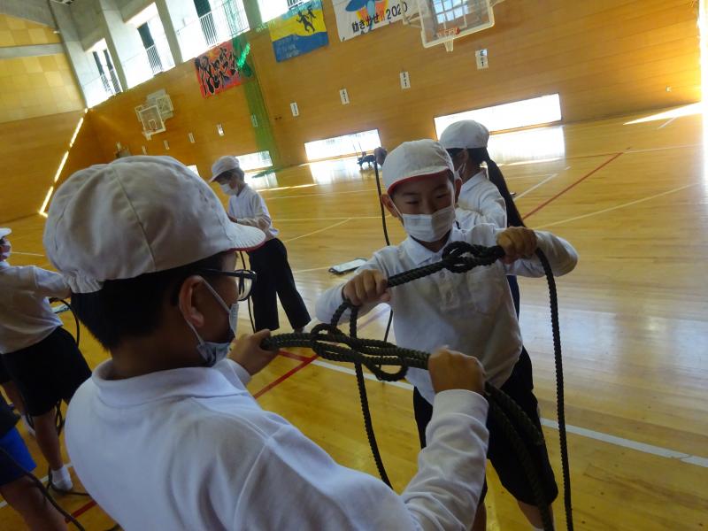 屋内の活動では,災害時に役立つ応急担架の作り方やロープの結び方を教えてもらいました。応急担架は棒2本と毛布1枚で大人も運ぶことができる担架を作り,自分たちで運びあっていました。ロープの結び方では2本のロープを長い1本にするための結び方を学び,自分たちで実践していました。