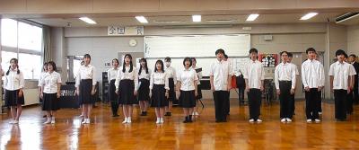 県立金沢二水高等学校合唱部(けんりつかなざわにすいこうとうがっこうがっしょうぶ)のみなさんが、あすなろ中学校(ちゅうがっこう)校歌(こうか)の斉唱(せいしょう)・二部合唱(にぶがっしょう)・四部合唱(しぶがっしょう)を披露(ひろう)してくれました。合唱部(がっしょうぶ)のみなさんが作(つく)ってくれた音源(おんげん)は、今後(こんご)様々な場面(さまざまなばめん)で活用(かつよう)していきます。