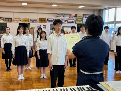 合唱部(がっしょうぶ)のみなさんへ、あすなろ中学校校長(ちゅうがっこうこうちょう)より感謝状(かんしゃじょう)を贈呈(ぞうてい)しました。