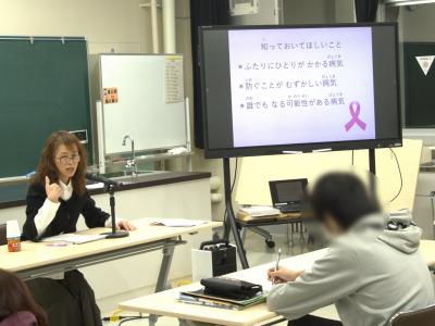 12/3に、外部講師の方に「がん」についていろいろと教えていただき、がん患者の方々との共生について勉強させていただきました。