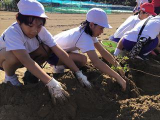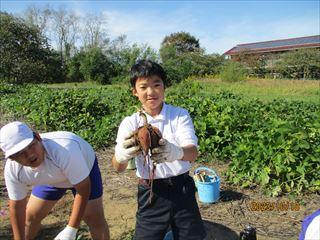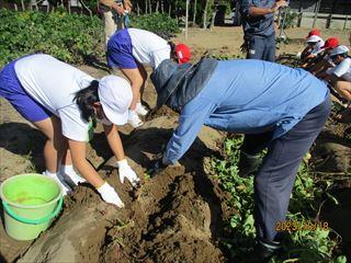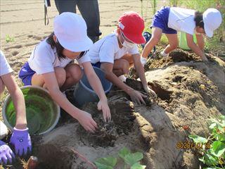 老人会の大橋さん,中村さん,川渕さんの指導のもと,4年生と6年生がサツマイモほりをしました。サツマイモを途中で折らないように丁寧に土をかきわけ,上手にサツマイモをほり出していました。夏場の暑い時期にも,しっかりと水やりのお世話をしたので,大きなサツマイモを収穫することができました。