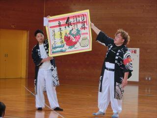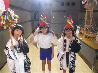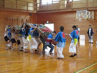 粟生町の獅子舞が学校に来てくれました。粟生町の子どもたちは一緒になって獅子舞をしたり,笛を吹いたりしました。力強い舞で大変迫力がありました。