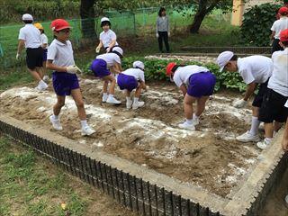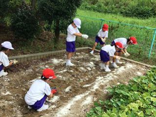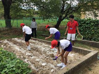 1~4年生は,白菜や大根などの秋野菜作りに取り組みます。今日は,石灰や肥料をまいて土づくりを行いました。