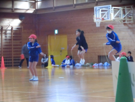 日頃の練習の成果を生かして、自分の挑戦したい技にチャレンジしました。今年は、個人の技も得点競技です。技を競った後には、団体での8の字のチーム戦。みんなで声をかけあいながら競った集会となりました。