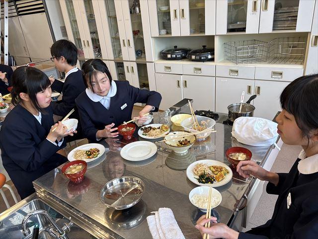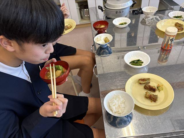 6年生は、グループの食材の買い出しを行い、楽しみにしていた調理実習に取り組みました。味噌汁やおかずなどそれぞれのグループで楽しく昼食をつくりました。教職員へも「味見」のプレゼントがありましたが、とてもおいしくできていました。