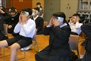 4年生は総合的な学習の時間で「みんなにやさしい町」の学習をしてきましたが,この日,講師に田鶴浜高校健康福祉課の先生3人を招いて,高齢者疑似体験の福祉出前授業を行いました。年を取るにつれて不都合が起こるお年寄りの耳の聞こえ方,見え方などを学習しましたが,「見えにくい,何かわかりにくい」などの声が上がっていました。また,かがんだ姿勢で周りが見えにくいことやひざや腰の負担,動きにくさなども体感しました。車いすでは,段差が越えにくいこと,自動販売機などで届きにくいものなどがあることを学びました。気づかなかったことが,すごくよくわかった時間となりました。