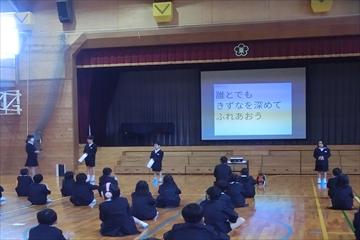それぞれの学年代表の人権標語を発表しました。どの標語も思いやりにあふれています。6年生は,人の気持ちを考えた行動の仕方についての劇をわかりやすく披露しました。また,縦割り班のふれあいゲームできずなを深めました。とてもあたたかな気持ちになれる集会となりました。