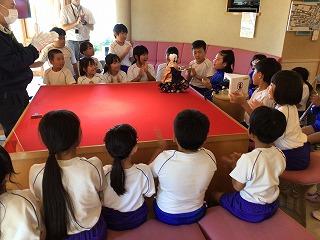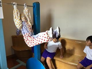 9月5日(金)に粟生町青年団の皆さんが,獅子舞を披露してくれました。粟生町の祭りは翌日の6日(土)ですが,羽咋市内では唯一宵祭りもしているそうです。この日は,団長さんが天狗を務めて,粟生町の子どもたちも蚊帳の中に入って踊ったり,笛を吹いたりして盛り上げてくれました。見ている子どもたちも「うちらと違う。町によって違うね。」と言いながら,自分たちの町の獅子舞について語る姿が見えました。