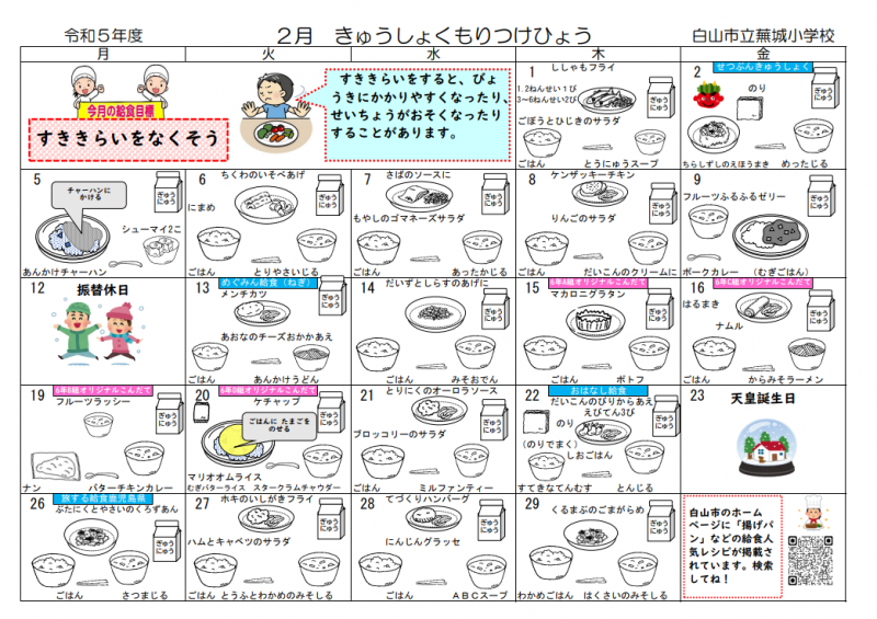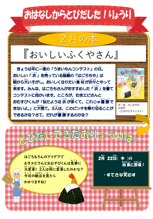 しっかり味わって食べてくれたことと思います。これからも自分の体のことを考えて食べられるとよいですね。毎日、たくさん食べてくれてありがとうございました!