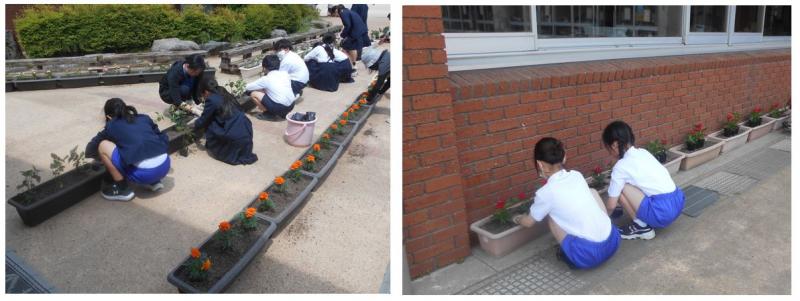 5月23日(金) 環境委員による花の苗植えを行いました。児童玄関と来賓玄関前のプランターにサルビア、マリーゴールド、日日草の苗を植えました。たくさんの花を咲かせ、楽しませてほしいものです。