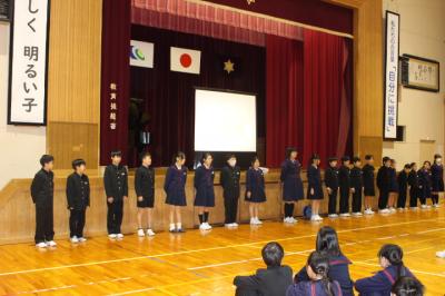 終業式では、冬休みのきまりについて「は・ひ・ふ・へ・ほ」のお話を聞きました。