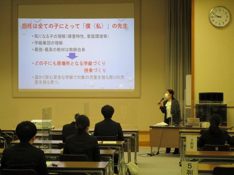 •  「同じ志を持つ仲間から刺激を受け、切磋琢磨しながら学び合うことができた。また、指導員の先生方からは丁寧な指導をいただき、質問すると+αを添えて返していただいたことで更に考えが深まるなど、毎回新鮮な学びができた。自分の思い描く理想の教師像をめざし励んでいきたい。」(小学校グループ代表)」