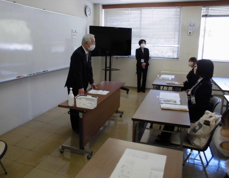この日、北野喜樹教育長は、塩田、金子両教育次長とともに、就任後初めていしかわ師範塾学生クラス標準コース(午前の部)を視察されました。新村塾頭から学生クラスの研修の取組みの現状と課題について説明を受けた後、教育長は、少人数に分かれて行われている模擬授業を熱心に参観し、受講生の着実な成長ぶりと指導員の卓越した指導ぶりに感銘を受けた様子でした。