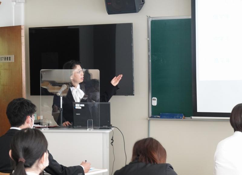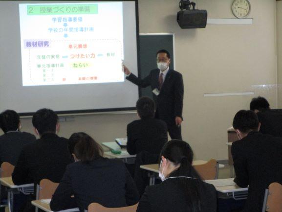 続いて、「授業のつくり方」の講義では、新学習指導要領が本格実施される中、主体的、対話的で深い学びの実現に向けた授業の工夫・改善について理解を深め、その後、受講生は11グループに分かれ、それぞれ「模擬授業」に取り組みました。指導員の先生からは、課題設定の仕方、発問の投げかけ方や板書の仕方など、具体的な助言を受け、指導力の向上に努めました。受講生からは「講義では、児童生徒が主役であることを再認識させられた。明日からは児童生徒が進んで学びたいと思えるような授業づくりをしたい」「他の受講生の模擬授業を見ることで刺激を受け、多くのことを吸収することができた。もっと頑張らねばと思う」などの感想が寄せられました。