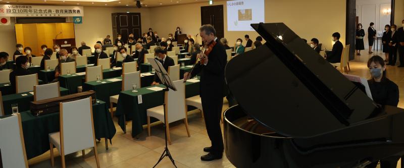 いしかわ師範塾が設立10周年を迎えたことを祝う記念式典・教育実践発表を7月10日(土)、ホテル金沢で行いました。オープニングセレモニーでは、乗富政雄氏(師範塾指導員)、乗富晴子氏(県立鶴来高校教諭)がマスエ作曲「タイスの瞑想曲」、エルガー作曲「愛の挨拶」を披露しました。
