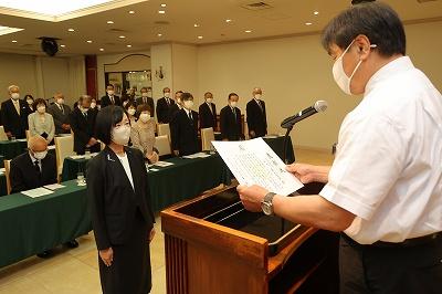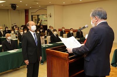 続いて長年にわたり師範塾の指導員として本県の教育に尽力された47名の代表者に指導功労者表彰状が授与され、受賞者を代表して笠間指導員は「師範塾に関わることができたことを誇りに思う。今後も指導員として研鑽を積み、塾生の教育に対する熱い思いに応え、石川の教育力の向上に寄与してまいりたい。」と謝辞を述べました。