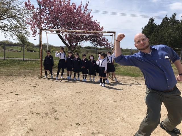 4月16日 昼休みに1年生とサッカーをして遊びました。時計を見て「時間になった!」と言って教室に戻って行きました。素晴らしいヾ(´∇`)ノ