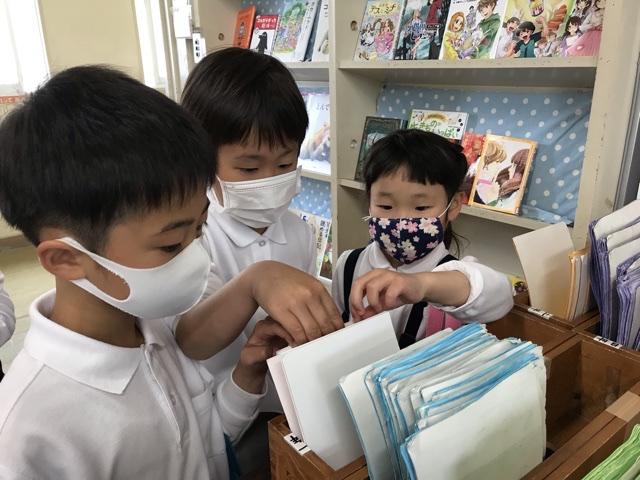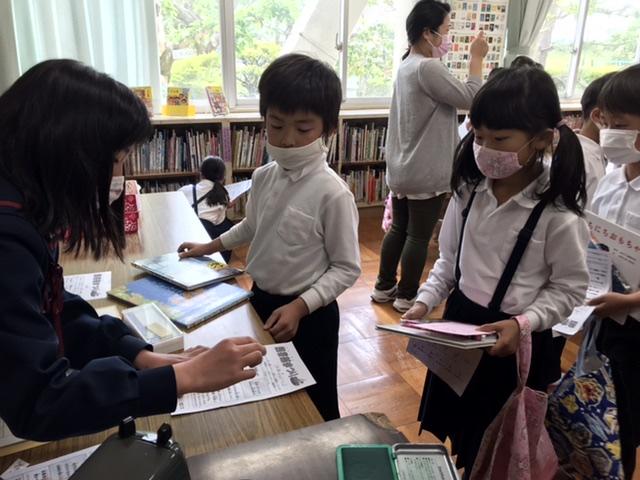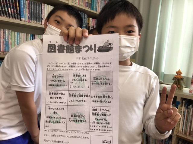 5月12日 図書委員会が、全校のみんなに本の楽しさを伝えるために、図書館まつりを開いてくれました。図書室は、静かに盛り上がっていました。