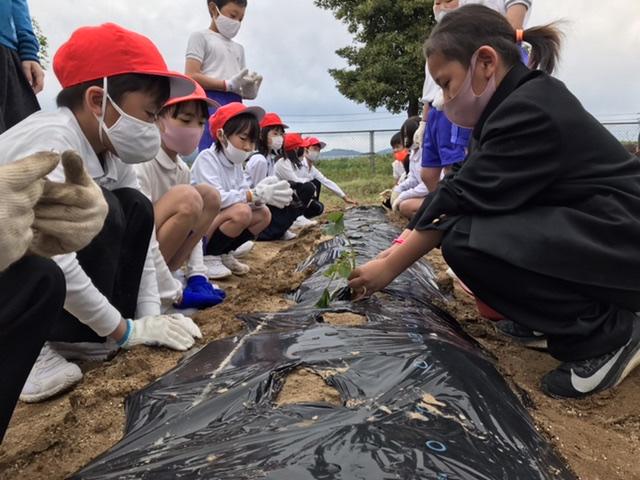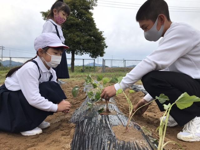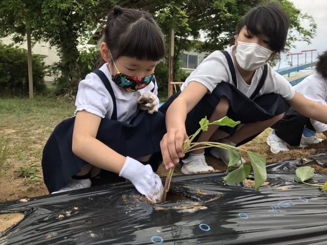 5月20日 さつまいもの苗を植えました。高学年が低学年に教える姿が何とも微笑ましいです。収穫できる日が待ち遠しい(^O^)
