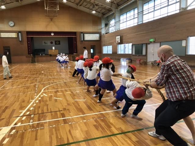 体育館での綱引きは、盛り上がりました。