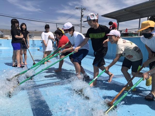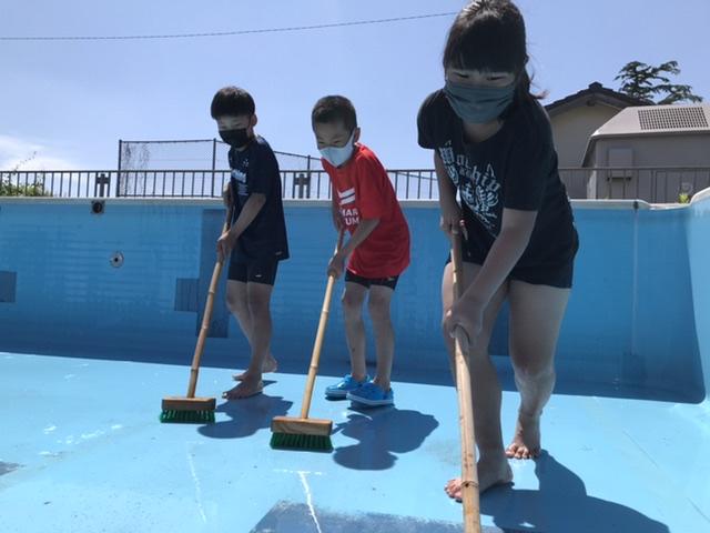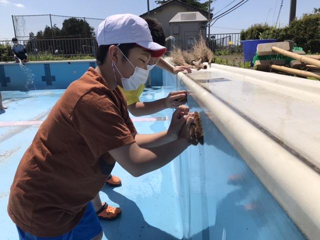 5月28日 天気がよく、プール掃除日和です。6年生が4.5年生に指示を出し、1時間程でキレイにしてくれました。