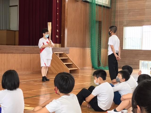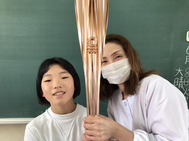 6月8日 勅使小学校に聖火トーチがやってきた。以前にボッチャでお世話になった先生がみんなのために持ってきてくださいました。