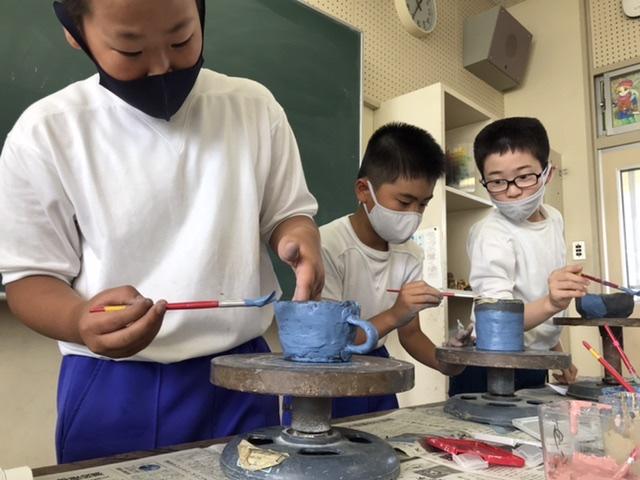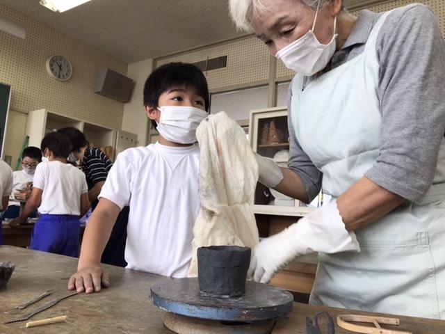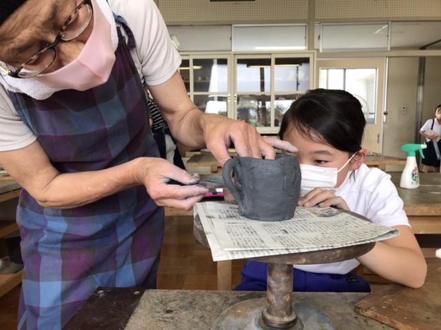 6月17日 陶芸教室が行われ、町の先生たちが教えに来てくださいました。教えてもらっている子どもは、尊敬の眼差しです。