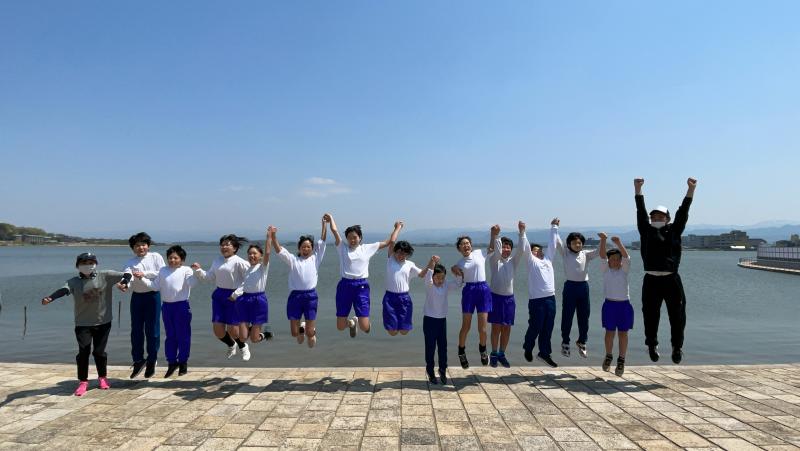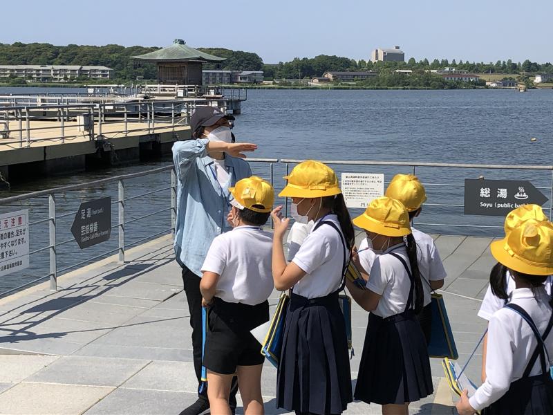 遠足で 56年生は 湖畔公園に 行きました。たくさん歩きました。