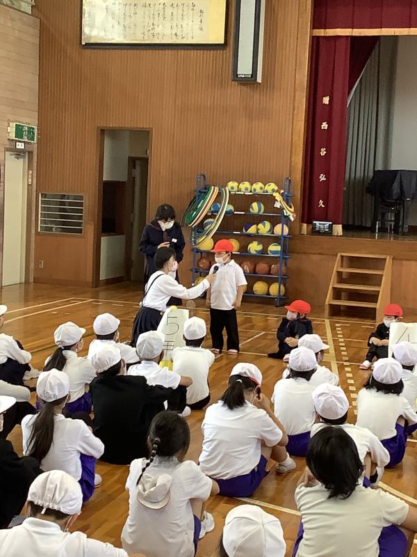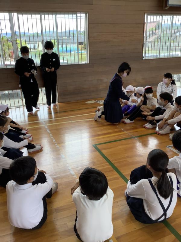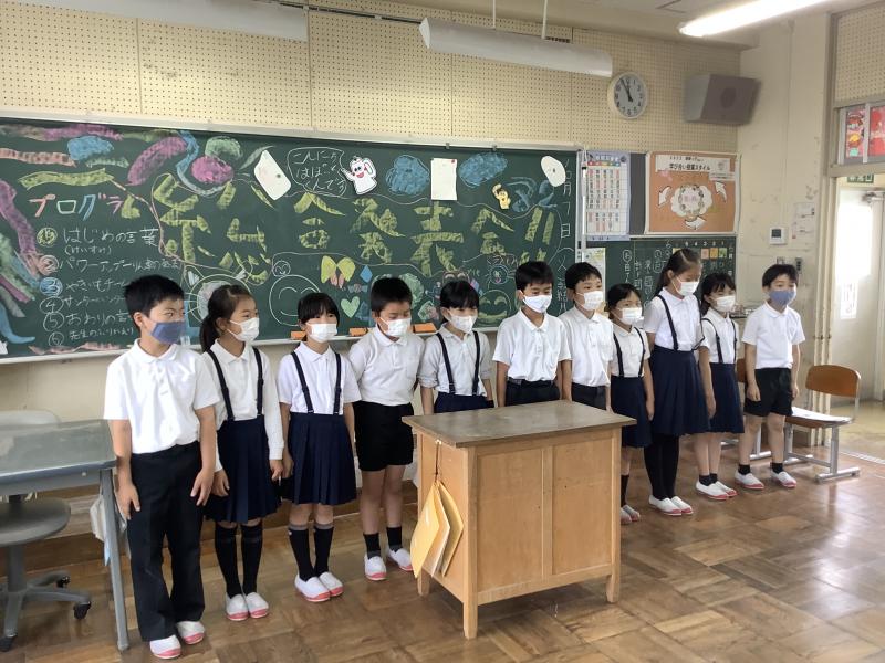 一年生 『先生こんにちは』で自己紹介をしています。元気にあいさつをして がんばっています。二年生もお手伝いをしています。