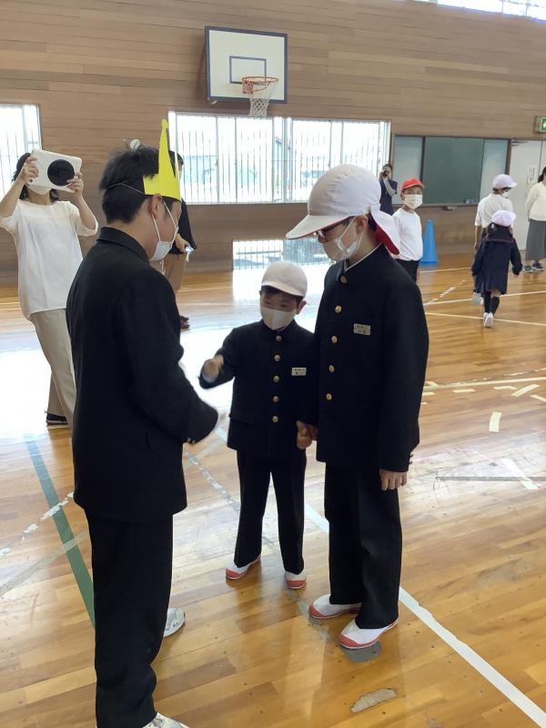 6年生が作ったファミリーのバッジを もらって1年生もうれしそうです。