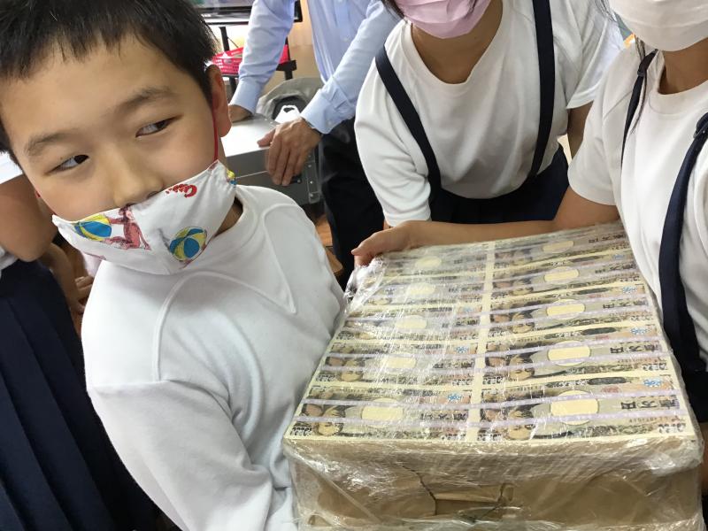 6年生は租税教室がありました。一億円の重さを体験しました。