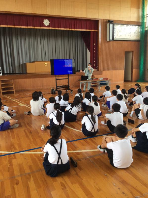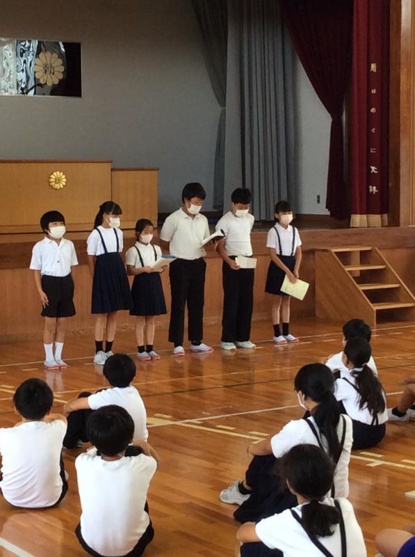 6年生による戦争についての説明や読み聞かせがありました。また全校で平和を願って折り紙の鶴をおりました。