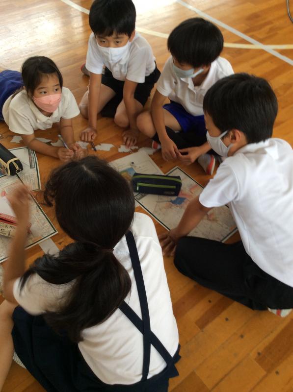 グループでハザードマップを見ながら 避難したら何が必要かなど、話し合いました。