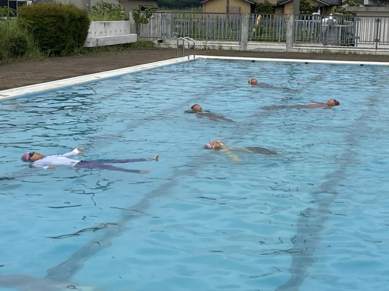 以前の着衣泳法の様子です。「浮いて待つ」ことの練習をしました。なかにはペットボトルを持たないで「浮いて待つ」ことができる児童もいました。