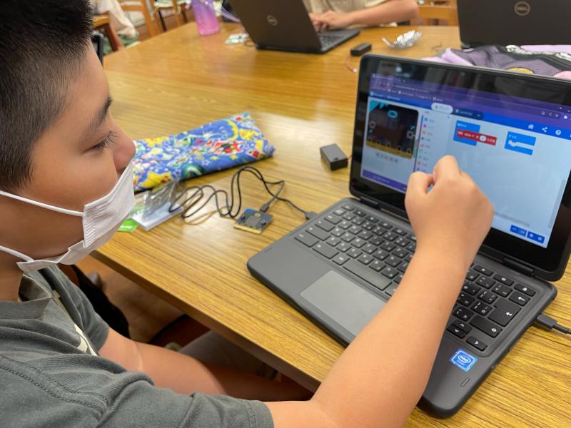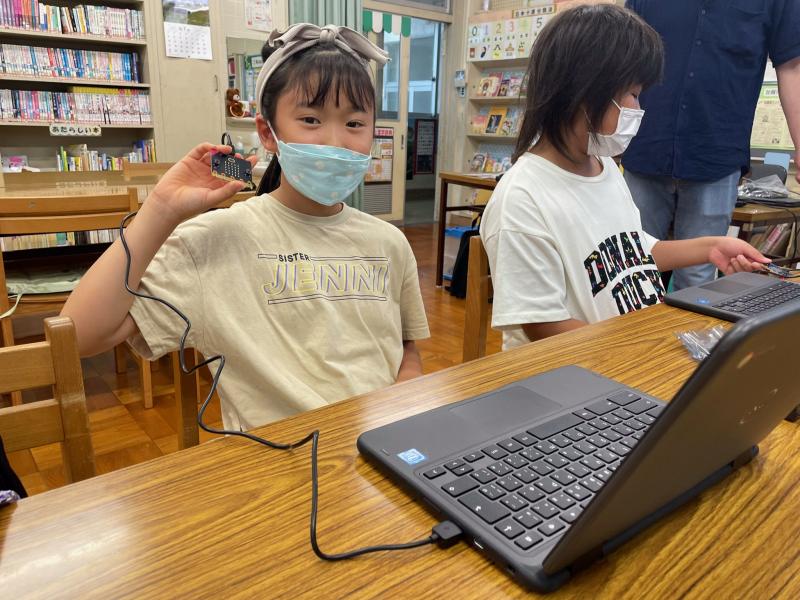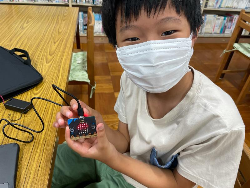 マイクロビット教室がありました。光の文字を書いたり音を鳴らしたりするプログラミングをしました。