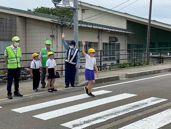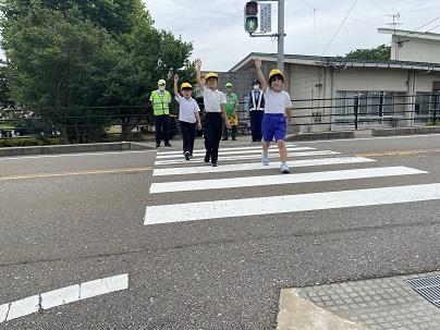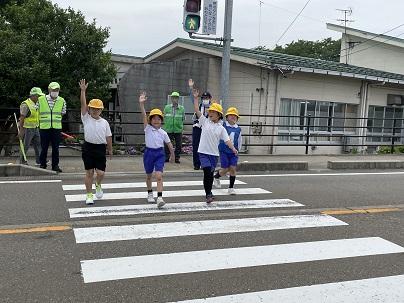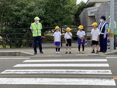 安全な歩行や横断の仕方を身につけ、交通安全に対する意識を高めるために行われている交通安全教室。キッズサポート隊や警察署員の方々のご協力のもとで行うことができました。