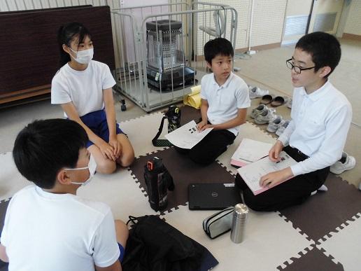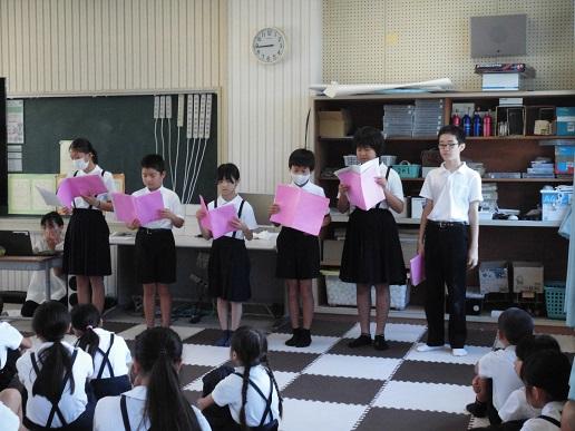 全校登校日のこの日、平和集会を行いました。児童会による沖縄戦の体験者の話や絵本の読み聞かせの発表を聞いた後に、8つのファミリーに分かれて「平和とはどういうことか」「自分たちにできることは何か」といったことを話し合いました。その後、みんなで平和への祈りを込めて折り鶴を折りました。全校で平和について考える時間となりました。